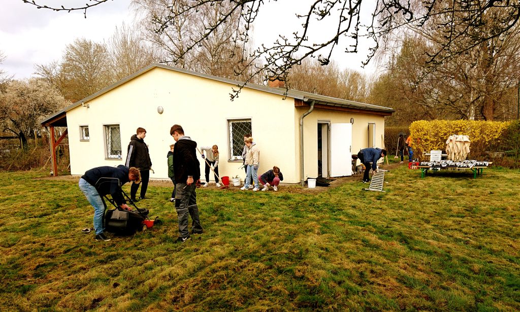 Nach Abschluss dieser Arbeiten war es an der Zeit, innerhalb und außerhalb des Gebäudes mal wieder richtig für Ordnung zu sorgen, kräftig auzuräumen und zu putzen. Hierfür trafen sich am dritten Wochenende im April fast 50 Helfer, Vereinsmitglieder, Eltern und Freunde, um kräftig Hand anzulegen. Mit solch einer großen Truppe ging es natürlich fix voran und nach einer kleinen Stärkung zum Mittag konnten die letzten Arbeiten abgeschlossen werden. Überall ist das Ergebnis dieses Frühjahrsputzes zu erkennen: Hecke geschnitten, Rasen gemäht, Einfahrt, Grillplatz und Parkflächen gereinigt, alles Holz gesägt und gehackt, Aufenthaltsraum und Waschraum geputzt, Lager aufgeräumt und entrümpelt und einiges mehr.